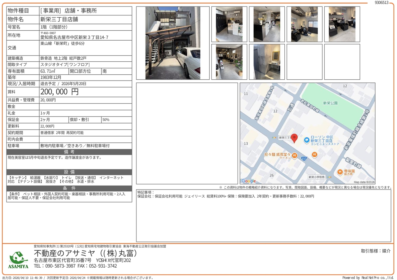 ・賃料20万円 【新栄町6分】 ・1階路面店 ・駅近! ・美容室居抜き物件 ・無料駐車場付き お問合せ電話(不動産のアサミヤ) TEL:052-931-3746 |